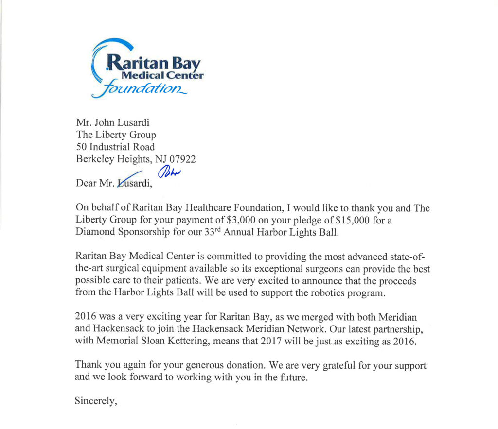On behalf of Raritan Bay Healthcare Foundation, I would like to thank you and The Liberty Group for your payment of…